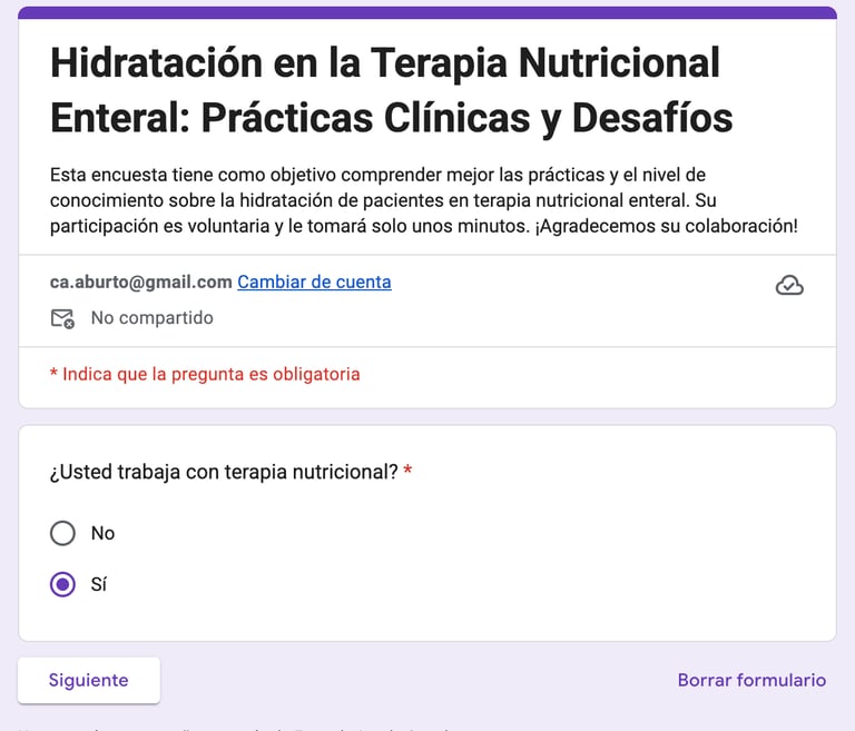 Esta encuesta tiene como objetivo comprender mejor las prácticas y el nivel de conocimiento sobre la hidratación de pacientes en terapia nutricional enteral. Su participación es voluntaria y le tomará solo unos minutos. ¡Agradecemos su colaboración!